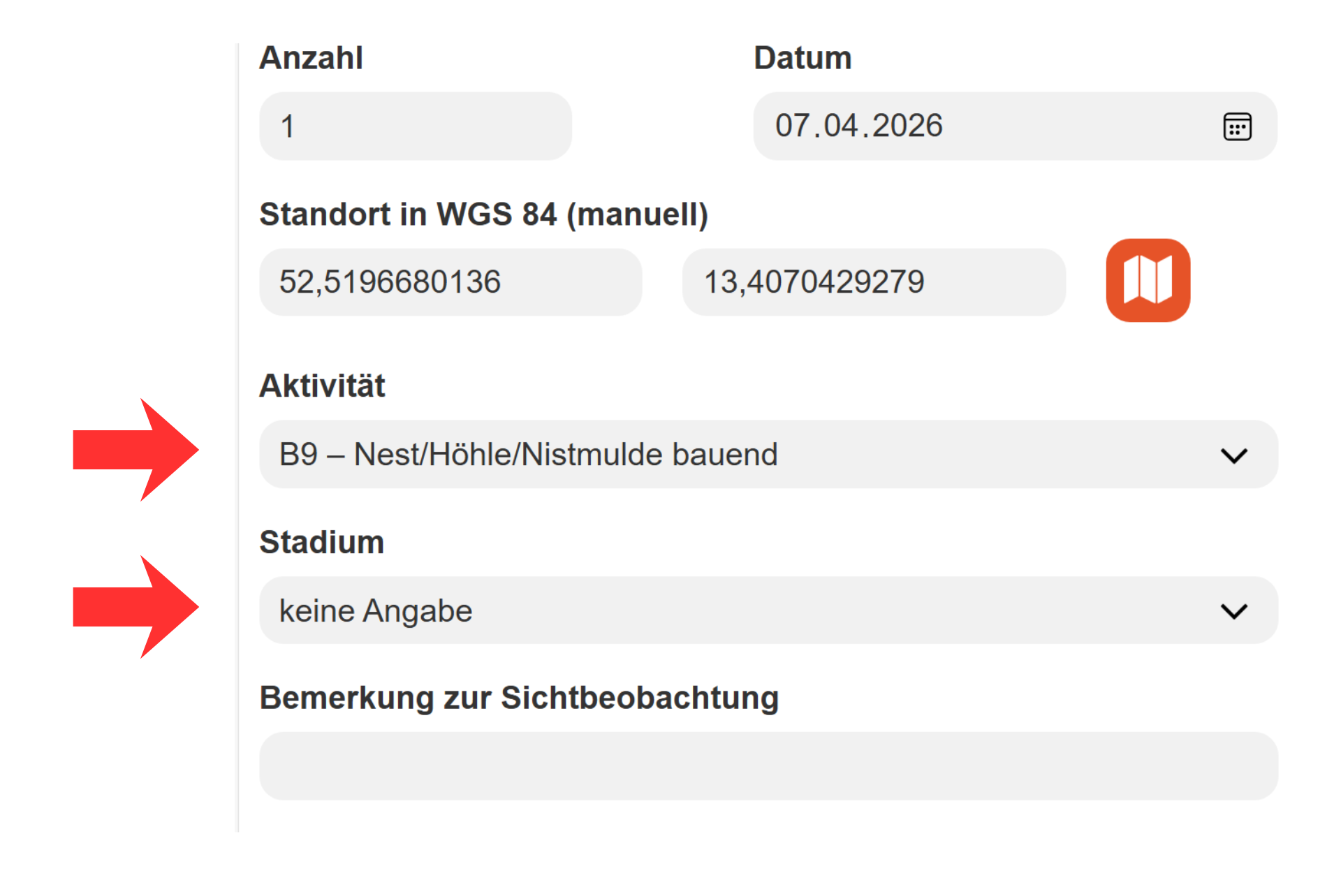 Durch die Brutzeitcodes werden manche bereits vorhandenen Kategorien unnötig, z.B. „brütend“, „Nest/Höhle bauend“, „Paarung“ (vollständige Liste siehe unten). Es wird eine kurze Übergangszeit geben, in der die Geschäftsstellen in Berlin und Rheinland-Pfalz diese überflüssigen Kategorien in alten Meldungen umwandeln werden. Diese Prozesse werden im Hintergrund passieren und bedürfen keiner Mitarbeit durch die Nutzer*innen. Nach dieser Übergangszeit werden die alten Kategorien gelöscht.