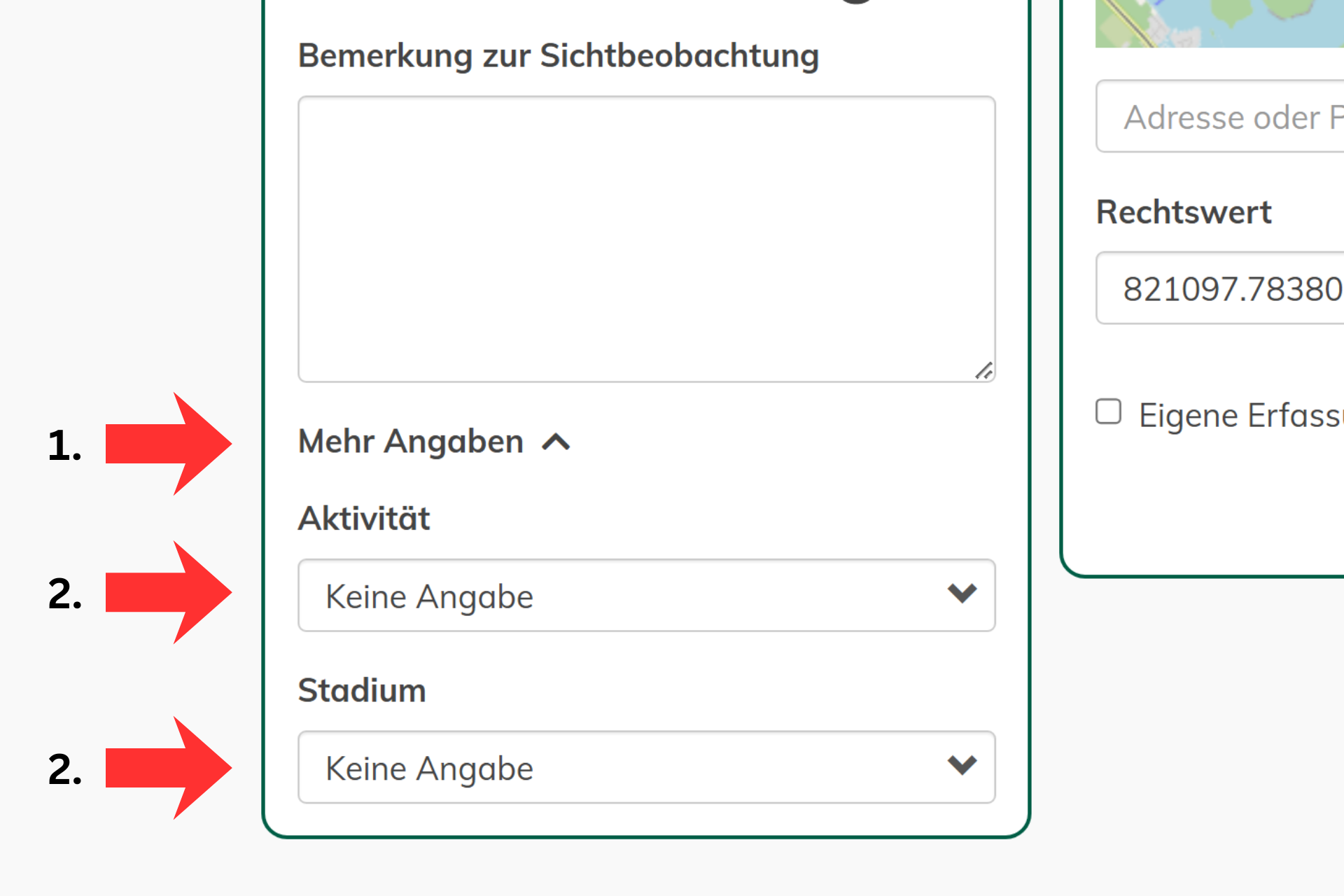 Im Webportal: Klicken Sie auf "Mehr Angaben" um entweder unter "Aktivität" oder "Stadium" den passenden Brutzeitcode zu finden.